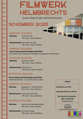 Als gemeinnützig anerkannter Verein zeigen wir Filme nicht, um damit Gewinne zu erzielen. Stattdessen liegt es uns am Herzen, den Bürger*innen aus allen Altersstufen ein Programm anzubieten, das nicht nur die verschiedensten Geschmäcker trifft, sondern auch pädagogisch wertvoll ist. Unser Kino wird durch die ehrenamtliche Mitarbeiter*innen (Kinder und Erwachsene) betrieben. Koordiniert wird diese Arbeit durch den Verein Die Gunga e.V. und den Helmbrechtser Jugendtreff. Die Kinovorstellungen basieren auf Spendenbasis, jeder gibt, was er kann und möchte.