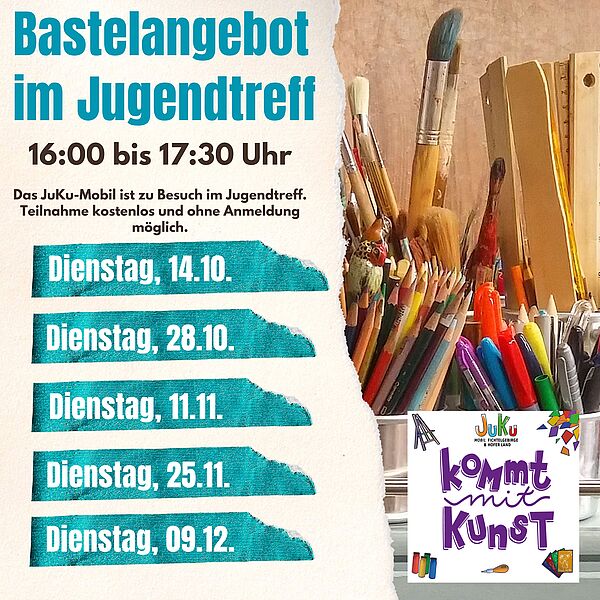 Donnerstag, 27.11.2025Aquarell-PostkartenHeute gestalten wir mit Aquarellfarbe verschiedene Postkarten. Lasst eurer Kreativität freien Lauf. Ab 16:00 Uhr im Jugendtreff.